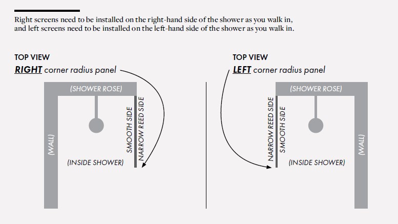 Note: You must either choose a Right or Left Panel depending on your shower screen layout. For ease of cleaning the narrow reed side must be installed on the outside of the shower.